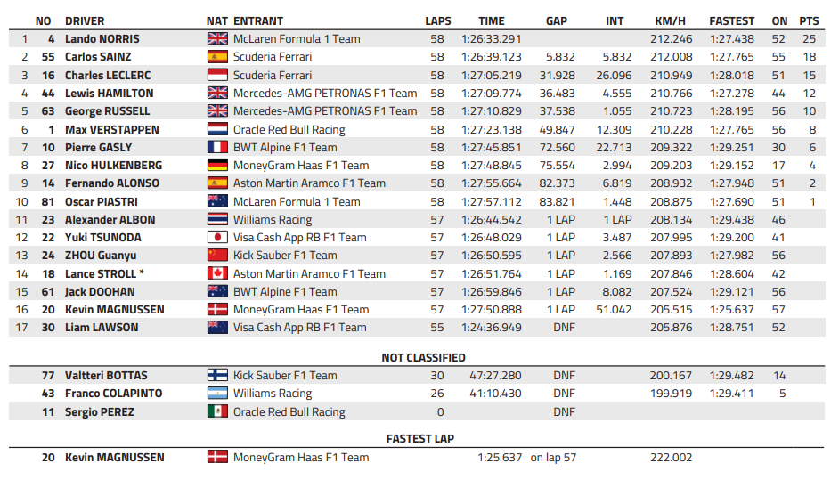 Norris s'impose et permet ainsi à McLaren de remporter le titre constructeur pour la première fois depuis 1998. Sainz et Leclerc montent sur le podium mais ce n'est pas suffisant, et la Scuderia termine à la deuxième place du Championnat.