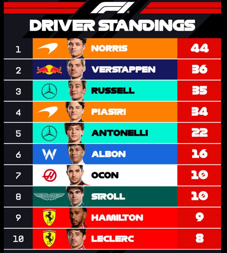 Meilleur Français et meilleur rookie, Isack Hadjar a réalisé une superbe performance lors des qualifications, en réalisant le 7ème temps devant Antonelli, Tsunoda et Albon. Esteban Ocon redresse la barre chez Haas avec la 11ème position, alors que chez Alpine, la performance en qualification n'était pas là avec Gasly 16ème et Doohan 18ème. A noter la dernière place pour Lawson qui ne parvient pas à s'en sortir avec une RedBull très rétive.