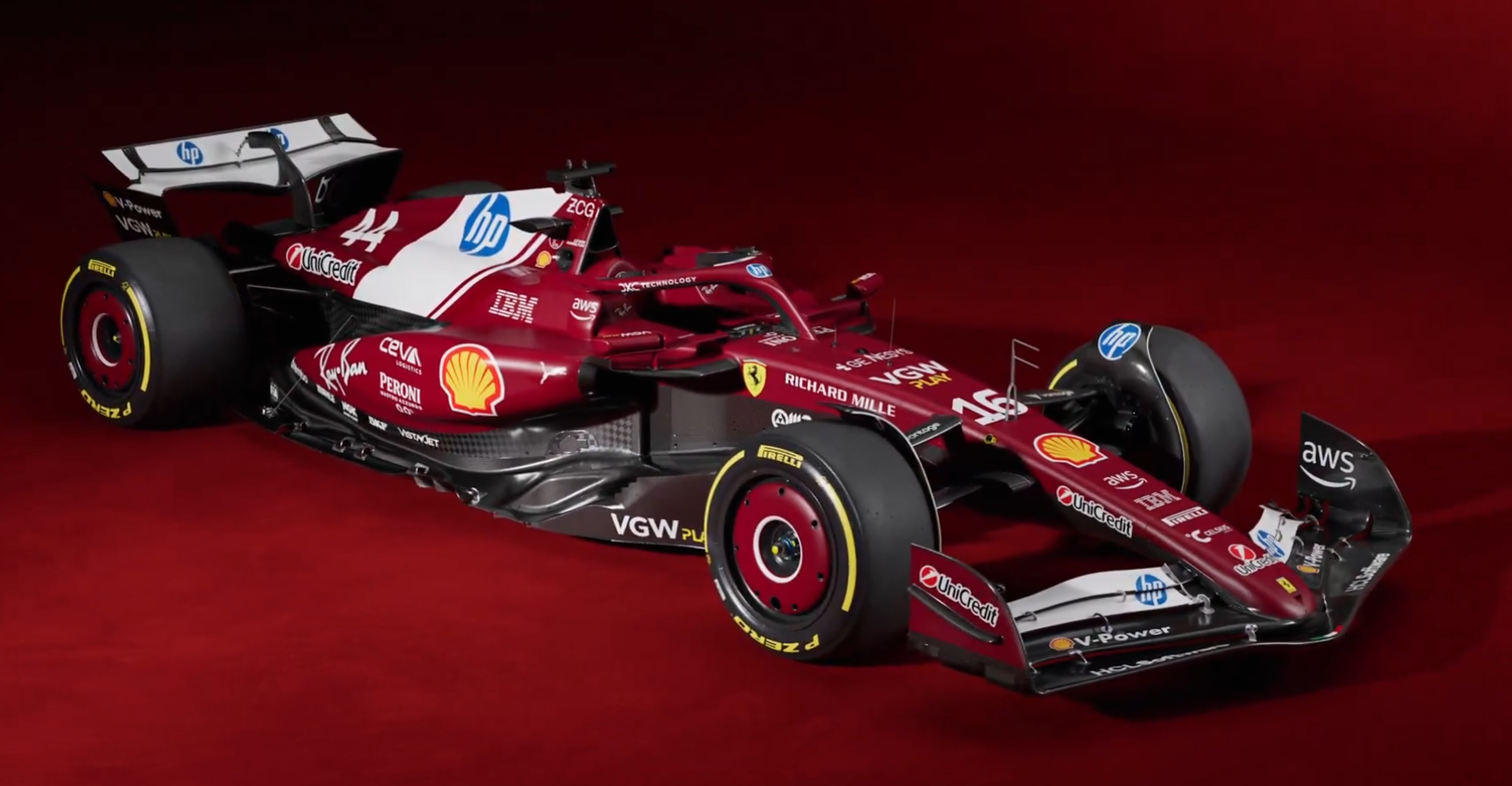Place ensuite à la Scuderia Ferrari, avec Charles Leclerc et l'arrivée désormais culte de Lewis Hamilton. Le rouge est un peu plus sombre sur cette SF-25, tandis que l'arrivée de HP se fait via un très gros logo sur le capot moteur avec un fond blanc qui divisera les fans. C'est sous un tonnerre d'applaudissement que Hamilton est monté sur l'estrade aux côtés de son nouveau patron Frédéric Vasseur et de son nouvel équipier.