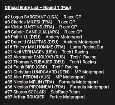 Coté pilotes on retrouvera des noms déjà vu l'an passé dans la catégorie comme Mick Schumacher, Ferdinand Habsburg, Daniel Ticktum ou encore Ralf Aron mais aussi des nouveaux talents à surveiller comme Marcus Armstrong ou Jüri Vips par exemple.